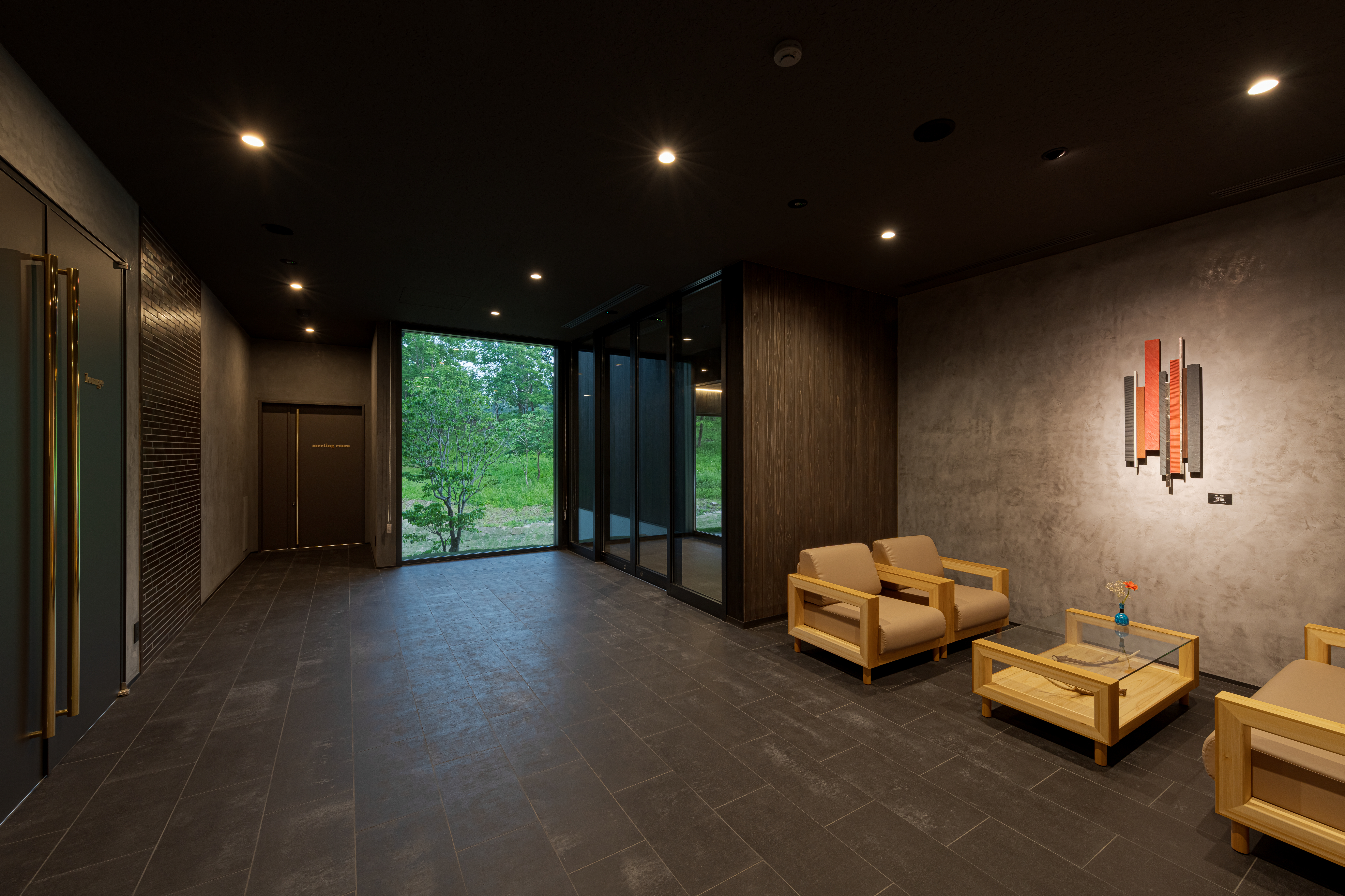 エントランスは高級感のあるインテリアと、地元岐阜県産のタイル壁・家具※によって彩られた空間でお客様をお迎えします。銘木や建築で使用されていた古材を使ったアートも飾られています。