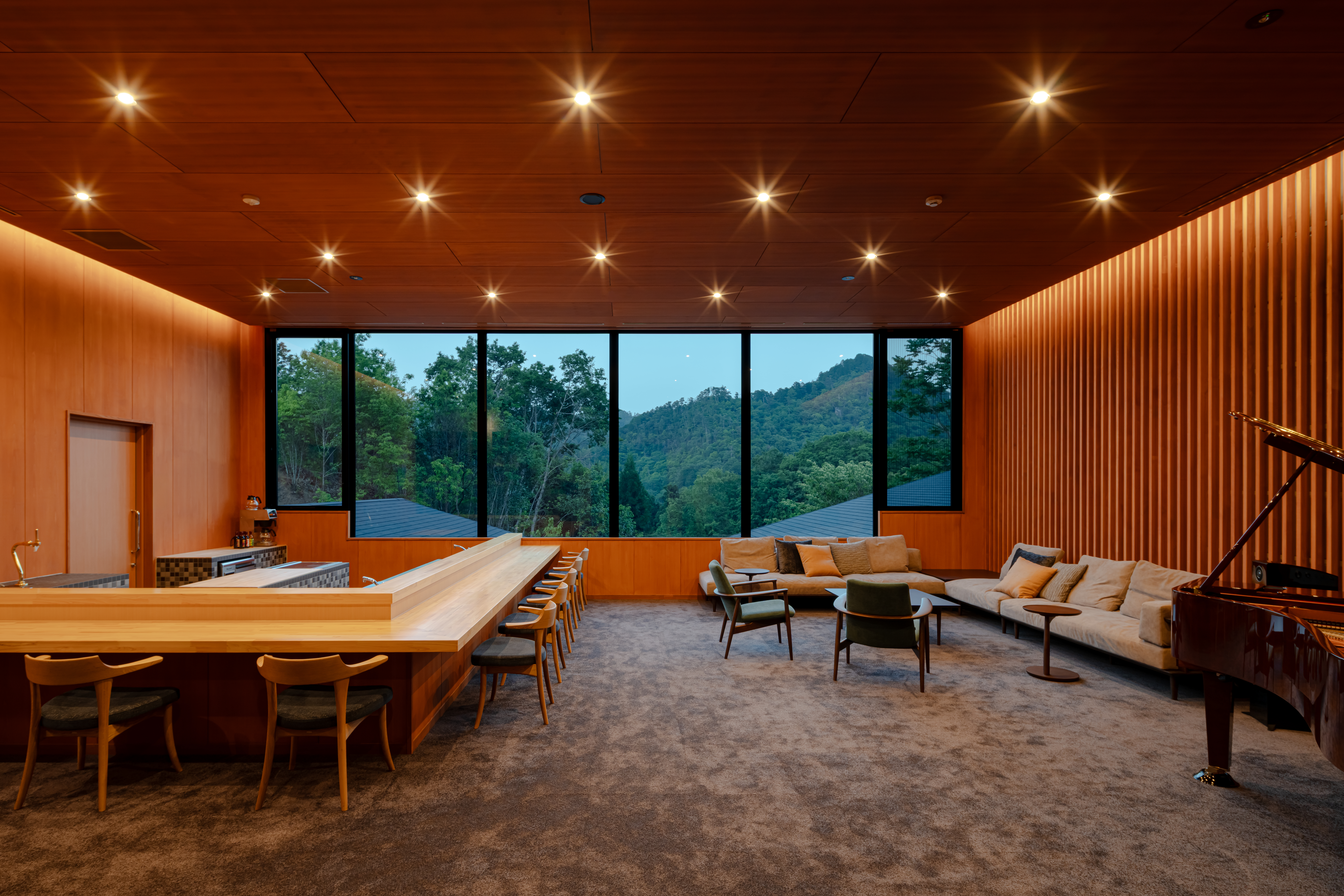 天井が高く、木質の素材に包まれた空間のラウンジでは、ゆったりとした雰囲気で食事を楽しむことができます。