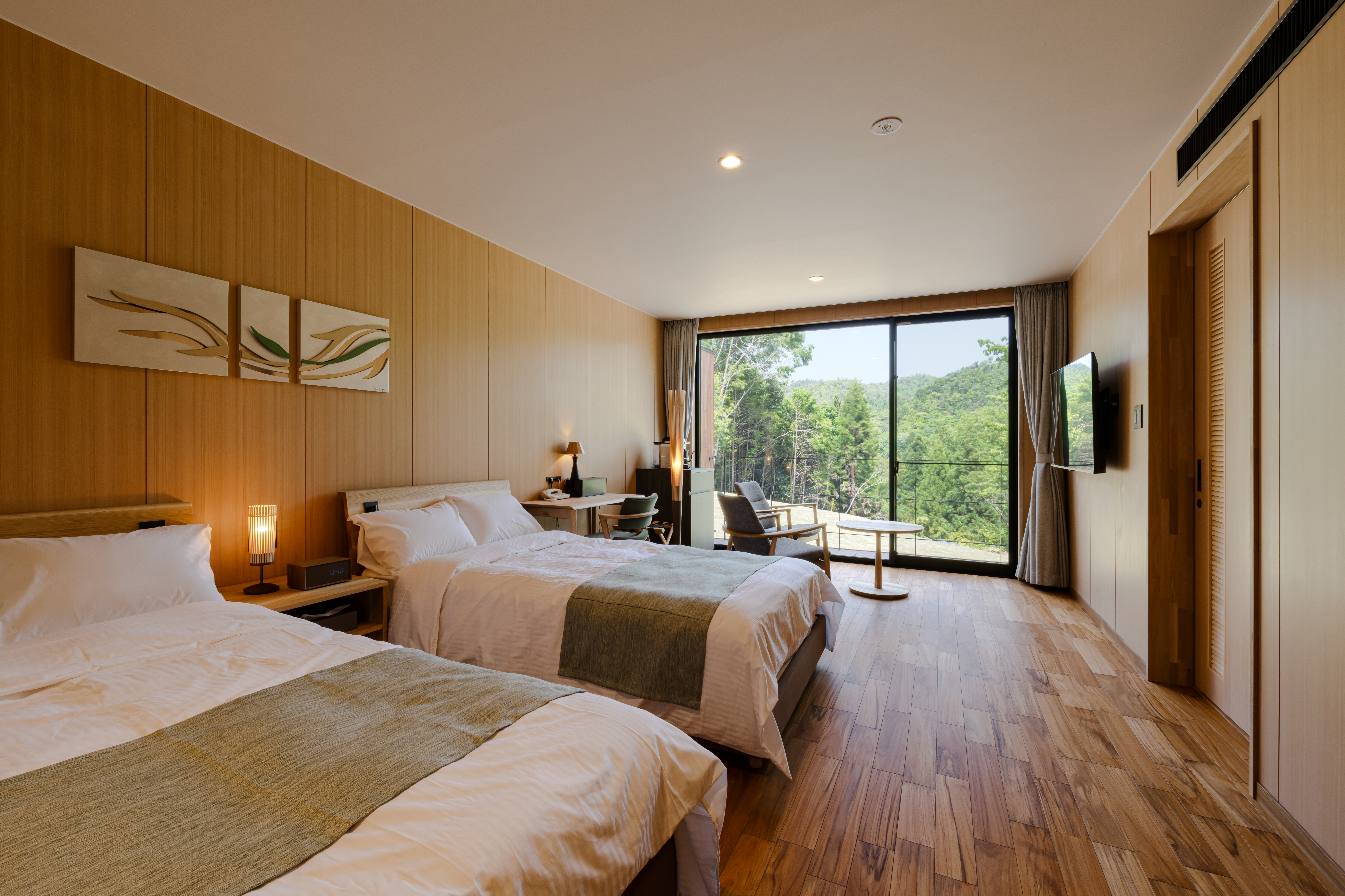客室は木質のインテリアと自然豊かな景色・家具※やアートによって心地よく宿泊できる空間に仕上がっています。